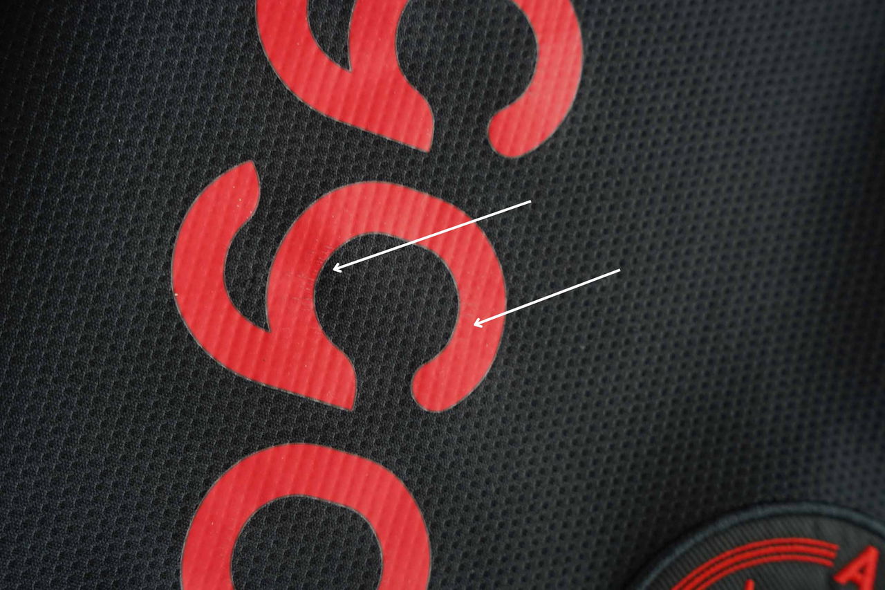 At first glance, you might not notice much of a difference. However, when you take a closer look at the lettering, you start to see that small cracks have formed in the sponsor of the Ajax shirt that went into the washing machine.